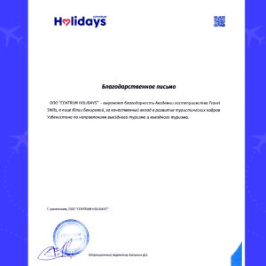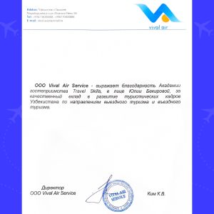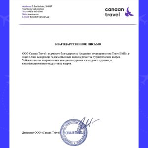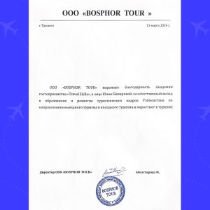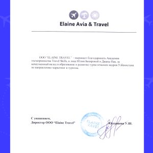 Treningdan so’ng biz sizga turistik kompaniyada ish topish imkonini beruvchi sertifikat beramiz va uning asosida siz o’z sayyohlik agentligingizni ochish uchun litsenziya olishingiz mumkin.