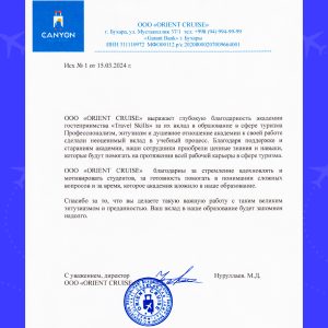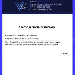 Salom. Travel Skills jamoasi! Ustozim Nigina Magadieva! Mehnatingiz, dars jarayonidagi qobiliyatingiz, qattiqqo’lligingiz, tajribangiz va halolligingiz uchun rahmat! O’zingizdagi barcha ma’lumotlarni qizg’onmasdan biz bilan borini bo’lishganligingiz uchun, Turismdagi sir asrorlarni yuqori darajada bizga urgatganligingiz uchun rahmat! Nigina Magadieva yaxshi ustozsiz, yaxshi maslahatchisiz! Mani gaplarimga butun jamaomiz qoshilsa kerak. Kelajakda ham hamkorligimiz davom etsin. Travel Skills akademiyasi bitiruvchisi Islom.
